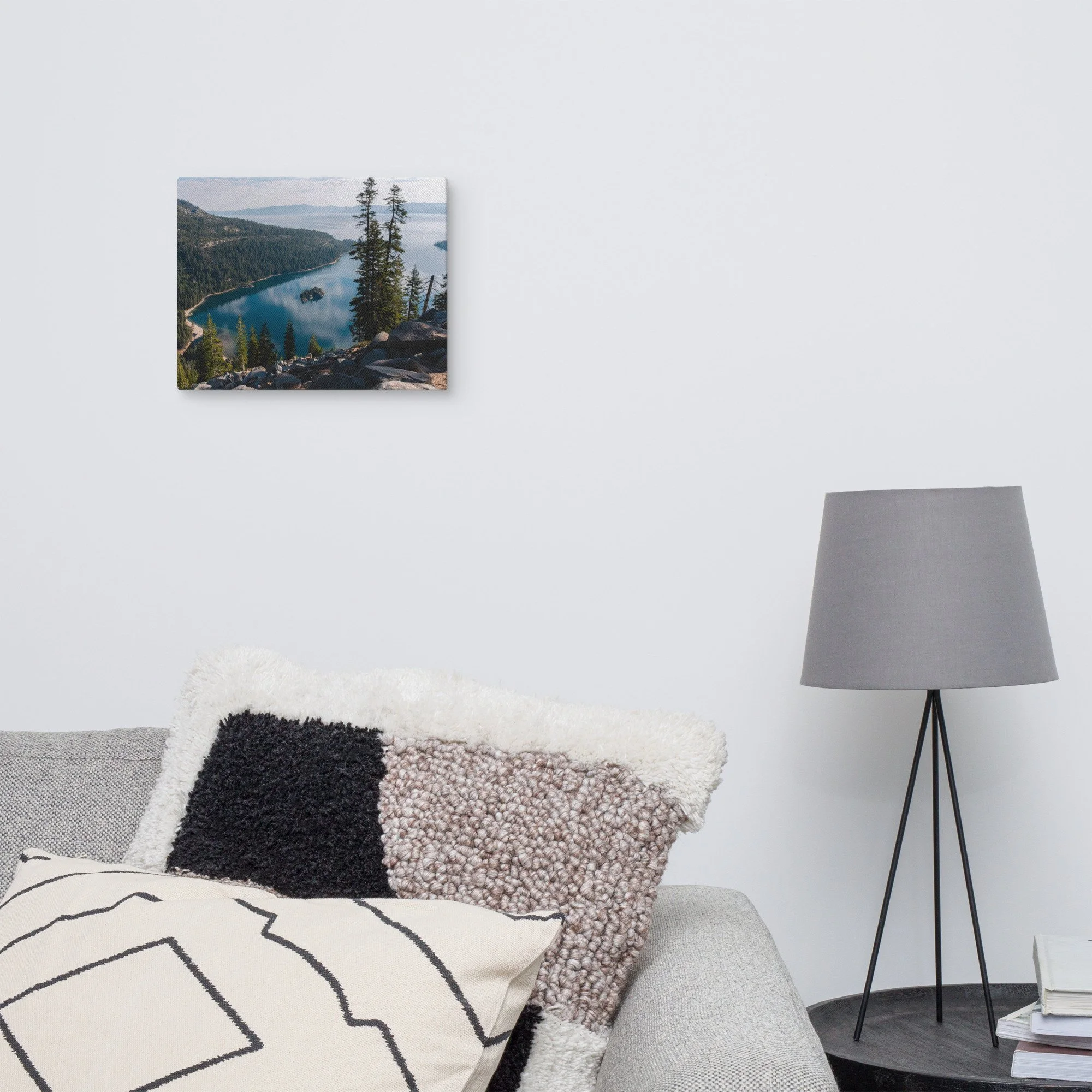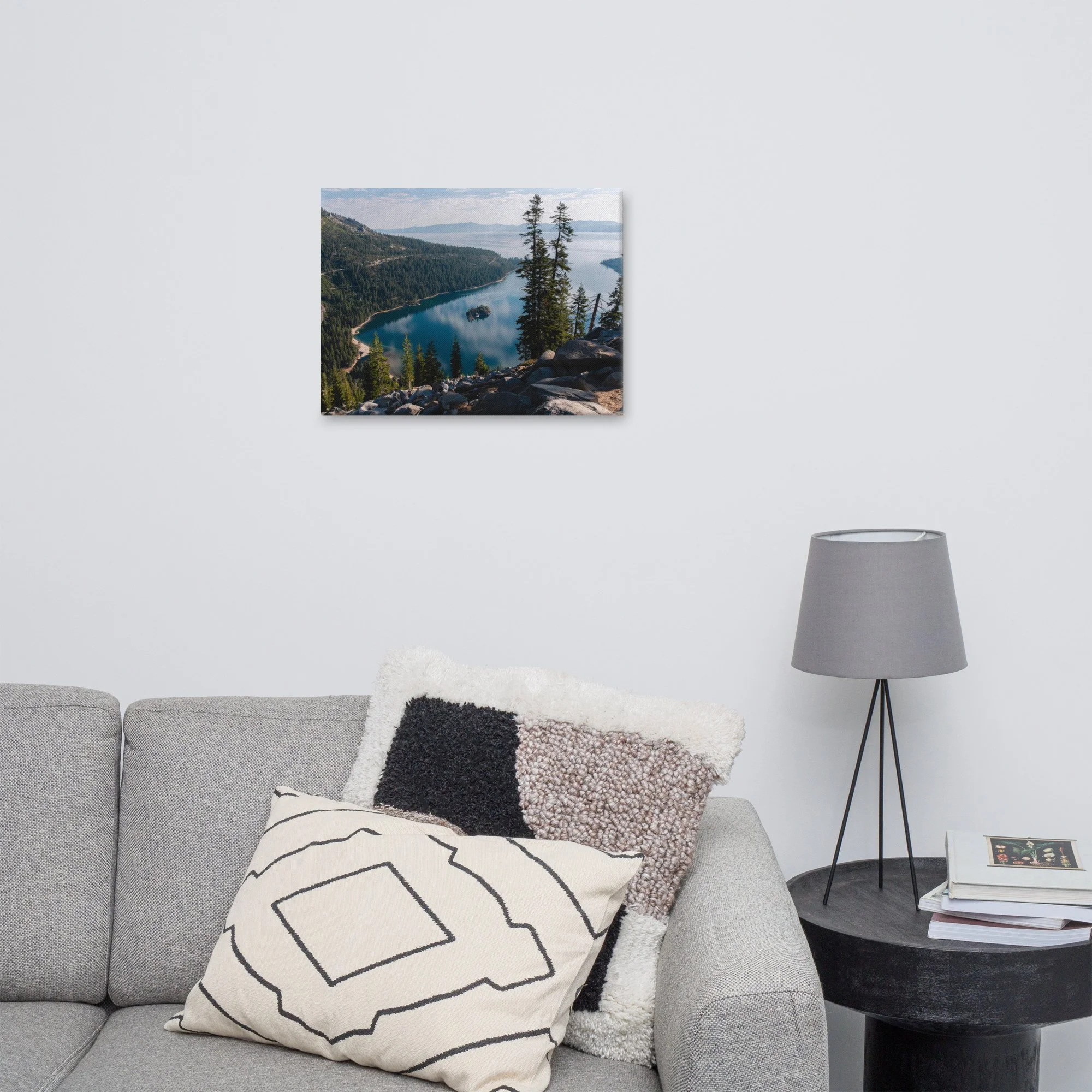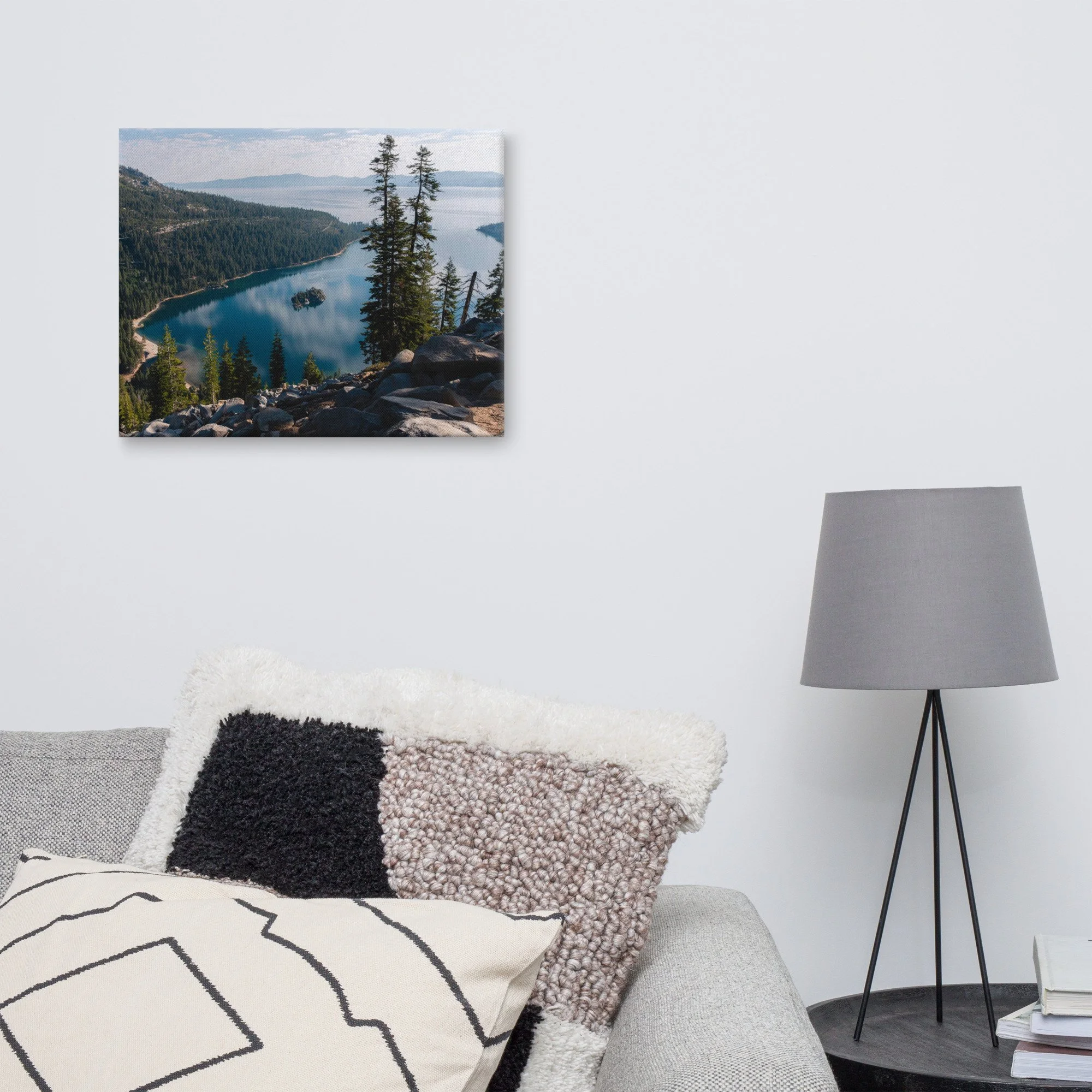 Crystal-clear alpine water in the Sierra Nevada, the granite shoreline and pine forest reflecting on the surface. Shot in late summer when the water is still warm enough to swim in and the light hits at that specific Sierra angle that makes everything look slightly unreal. Printed on Canvas and available in four sizes.