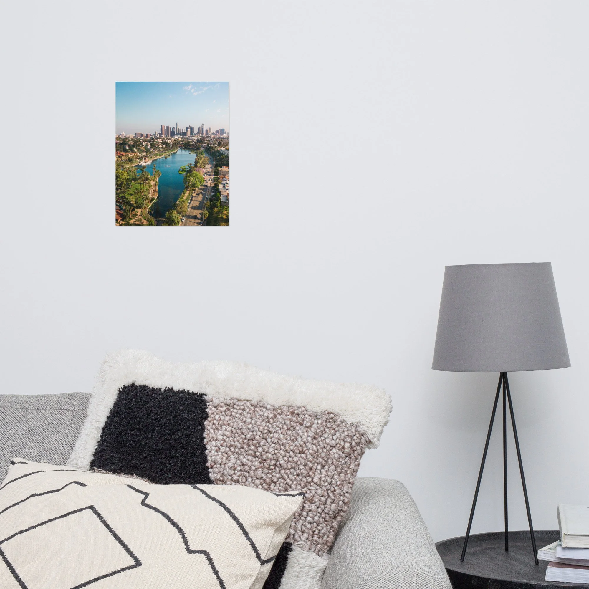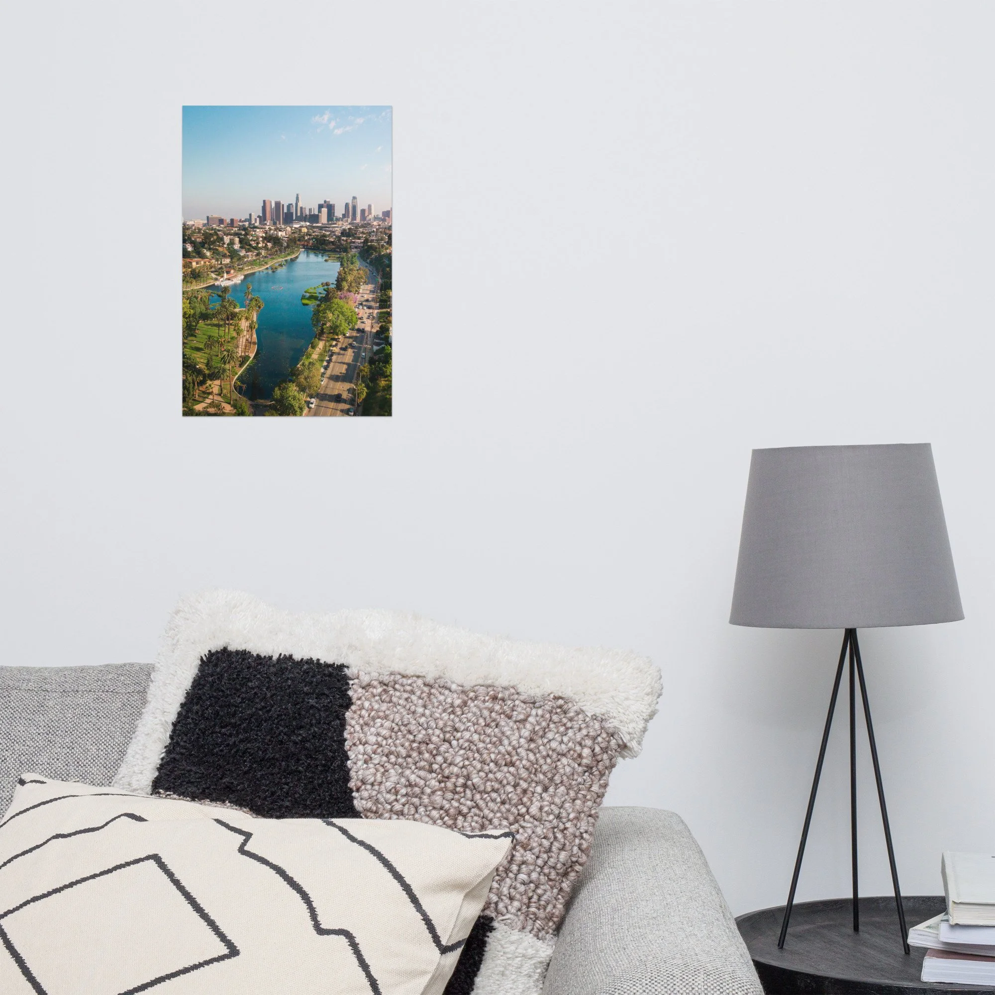 Echo Park Lake from the air, the full shape of the reservoir visible with the palm-lined paths surrounding it and downtown LA rising in the background. The vertical version emphasizes the skyline. The horizontal version emphasizes the lake. Both are available. Printed on premium luster photo paper with archival inks. Available in five sizes.