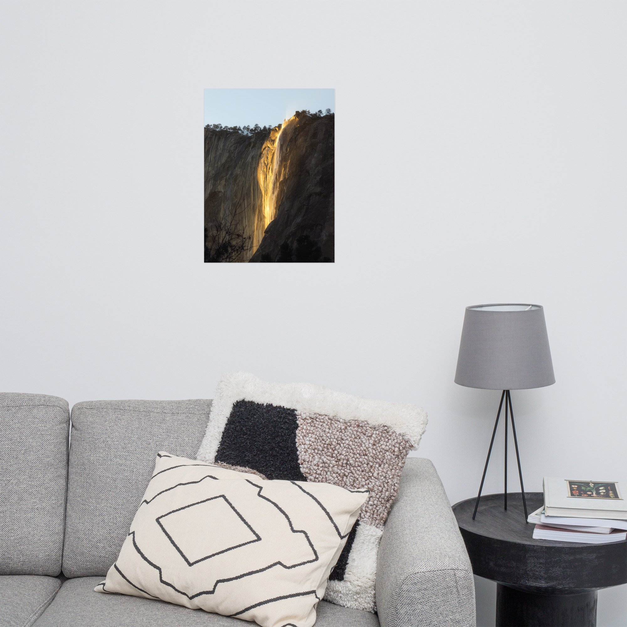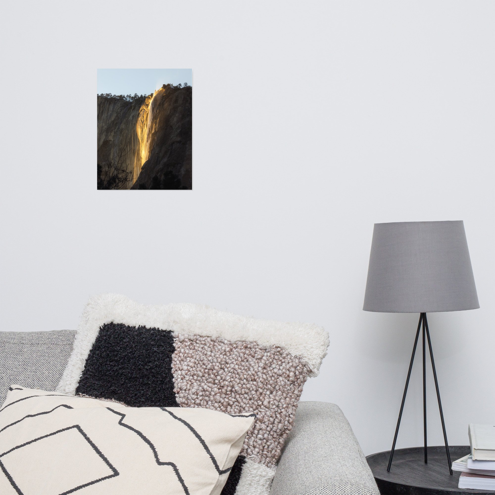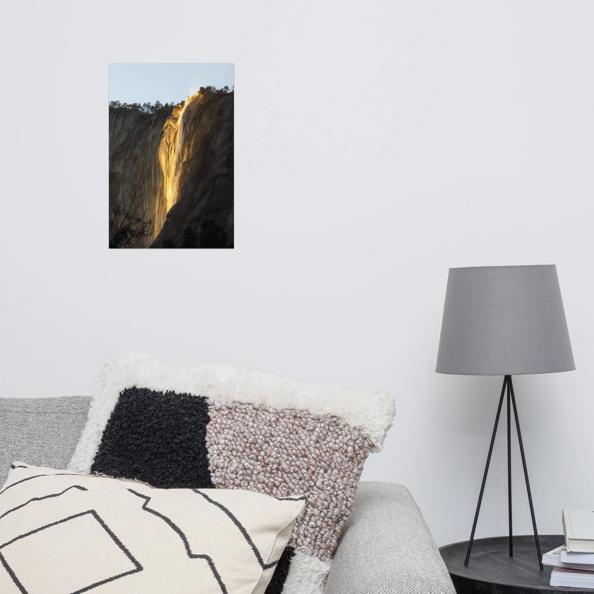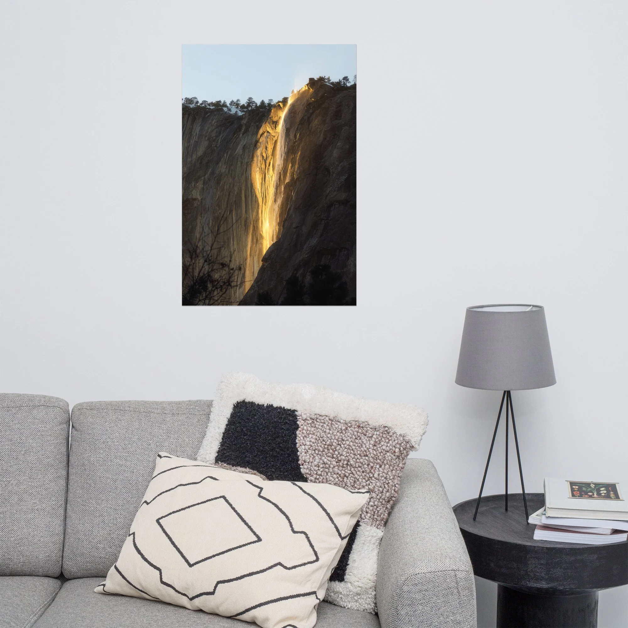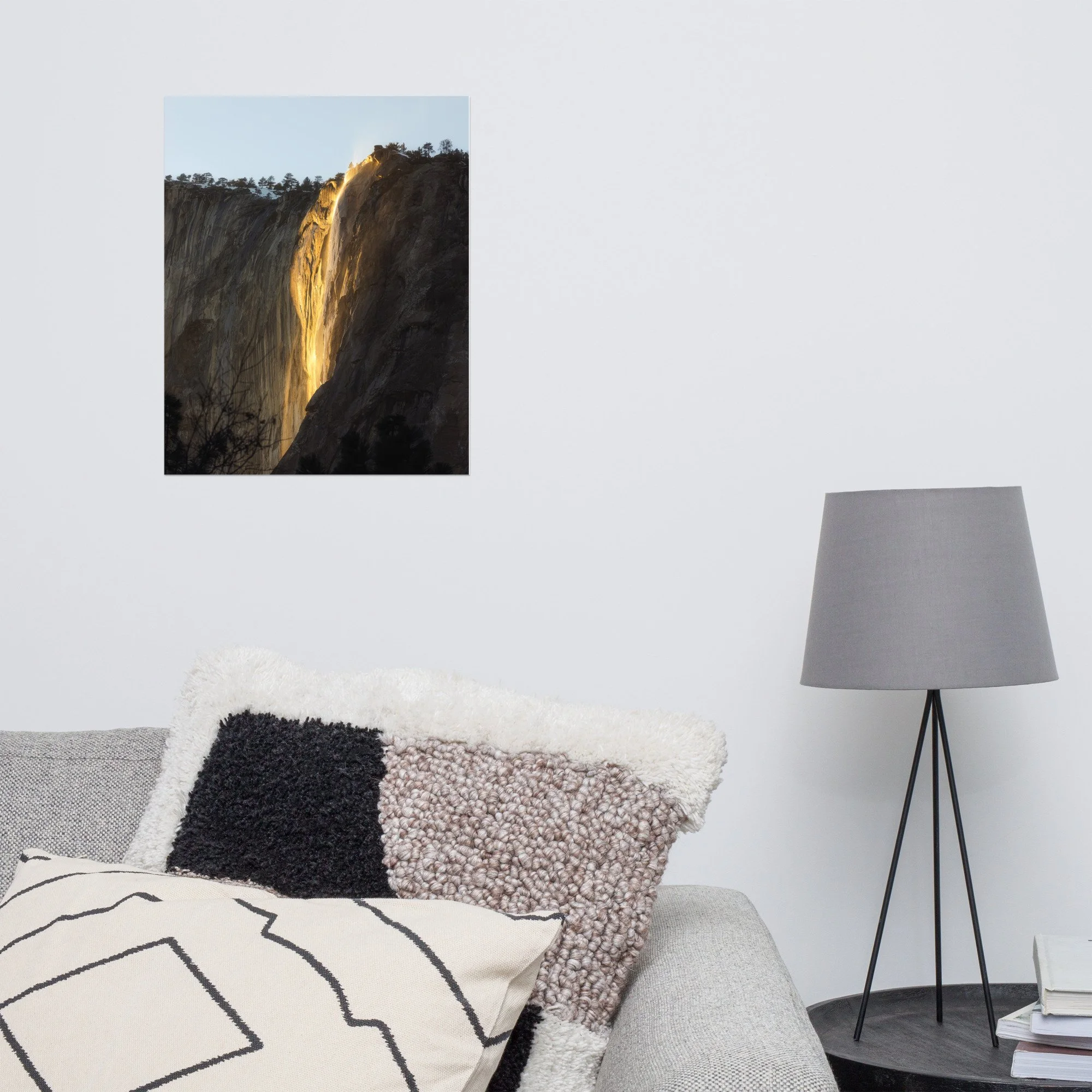 Every February, for about two weeks, the setting sun hits Horsetail Fall on El Capitan at exactly the right angle to turn the water into what looks like flowing lava. Photographers plan trips around this event for years. This shot catches it in the early stages, the orange just beginning to ignite on the granite. Printed on premium luster photo paper with archival inks. Available in five sizes.