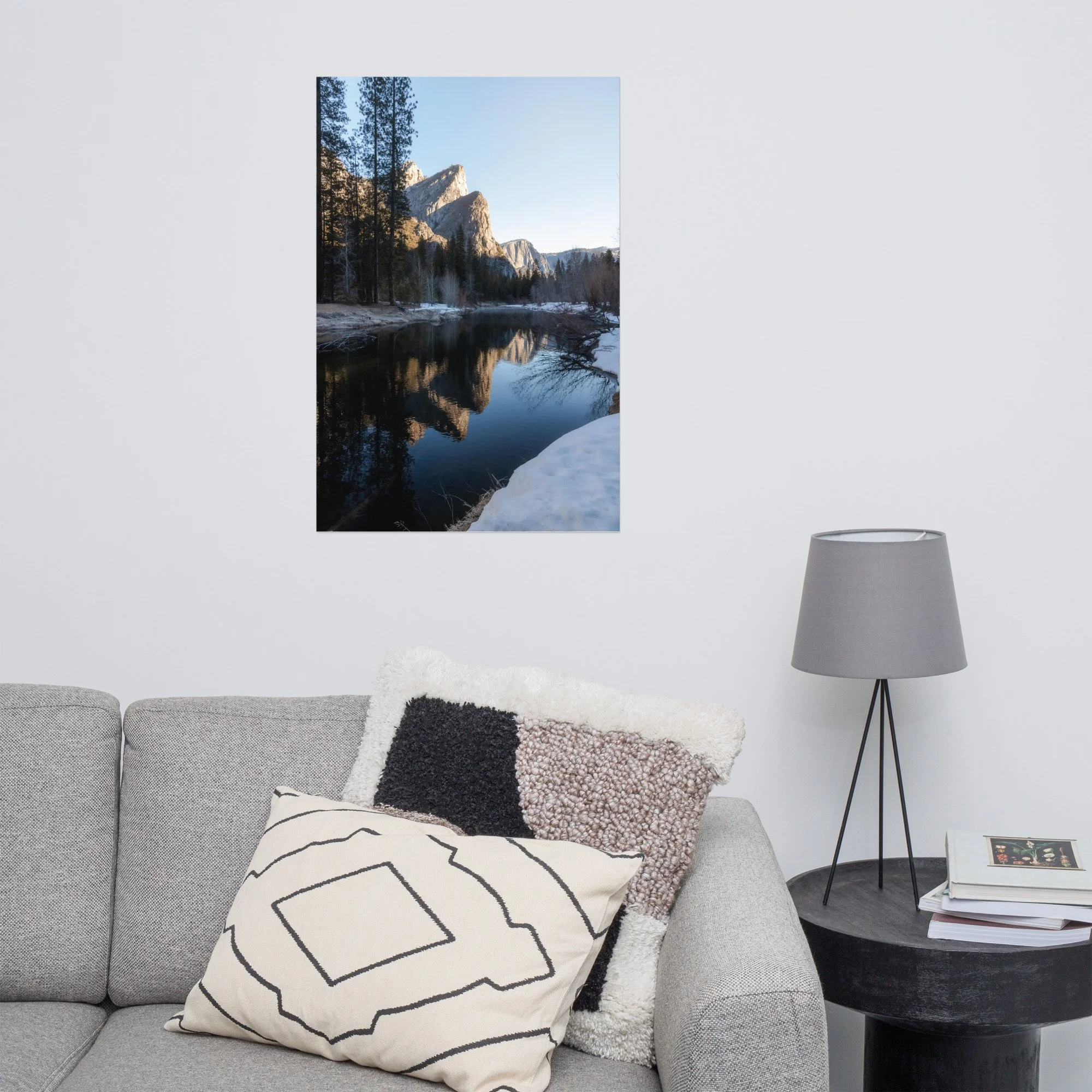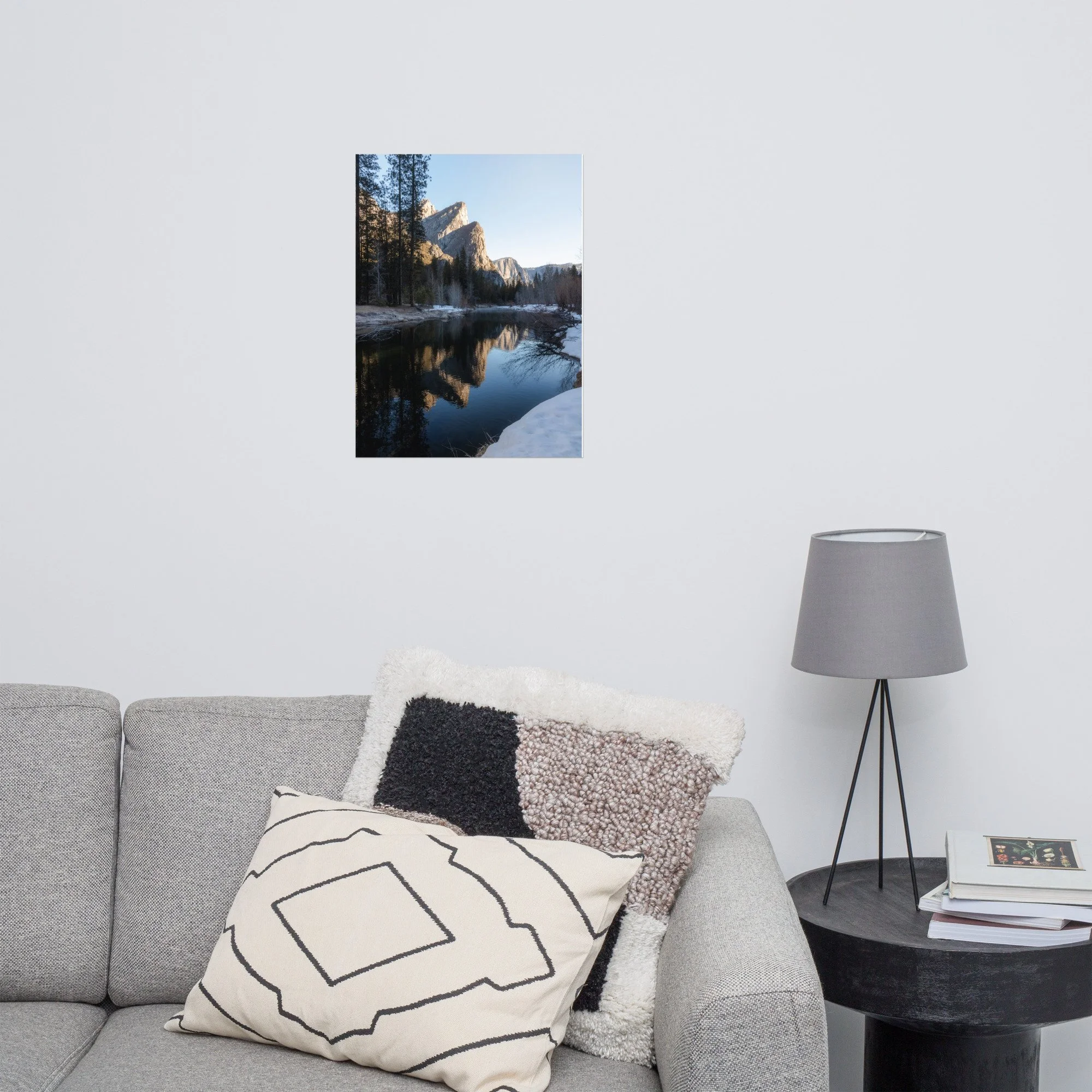 The Three Brothers, three stepped granite peaks stacked above the valley, photographed after a winter storm left fresh snow on every surface. The contrast between the white granite and dark pine forest is what makes this shot. Printed on premium luster photo paper with archival inks. Available in five sizes.
