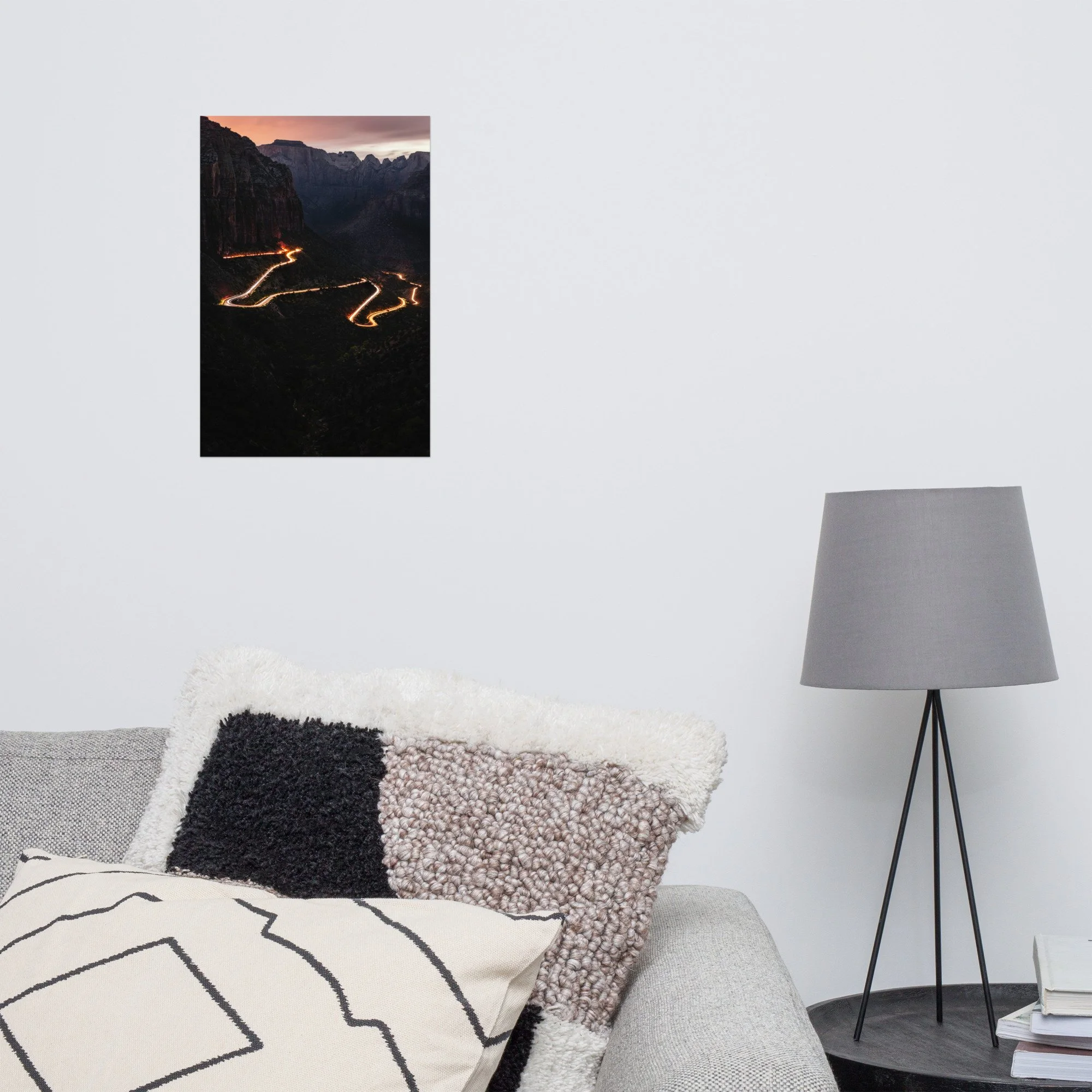 Long exposure light trails winding through Zion Canyon at night, the road through the park tracing a glowing path beneath the canyon walls. Shot well after the park crowds clear out, when the silence and the scale of the place hit differently. Printed on premium luster photo paper with archival inks. Available in five sizes.
