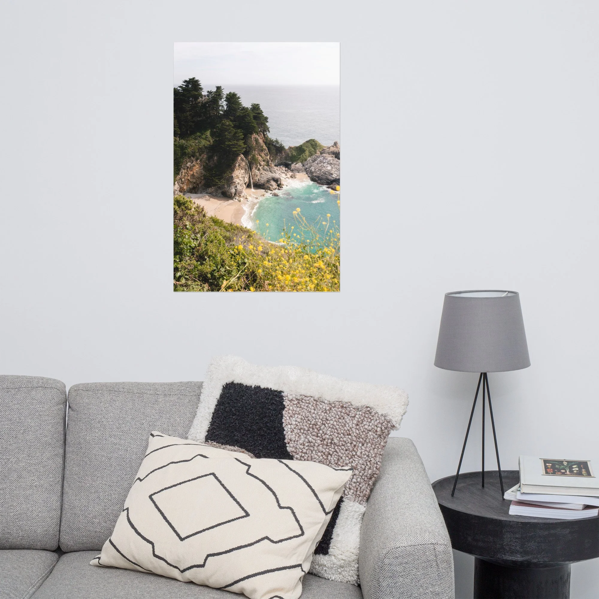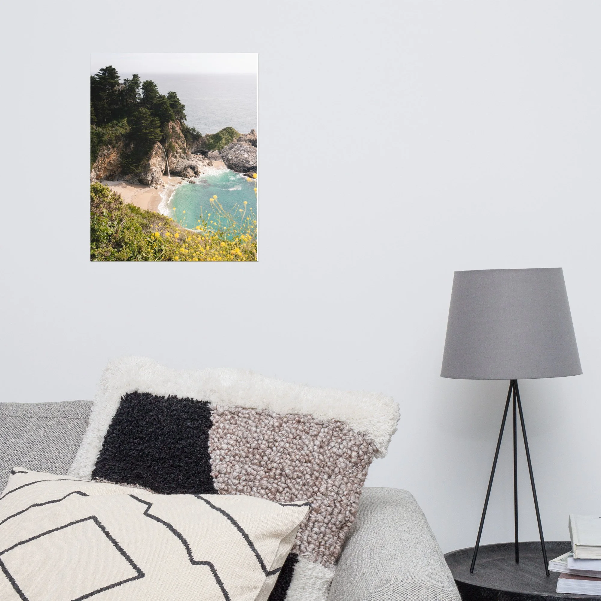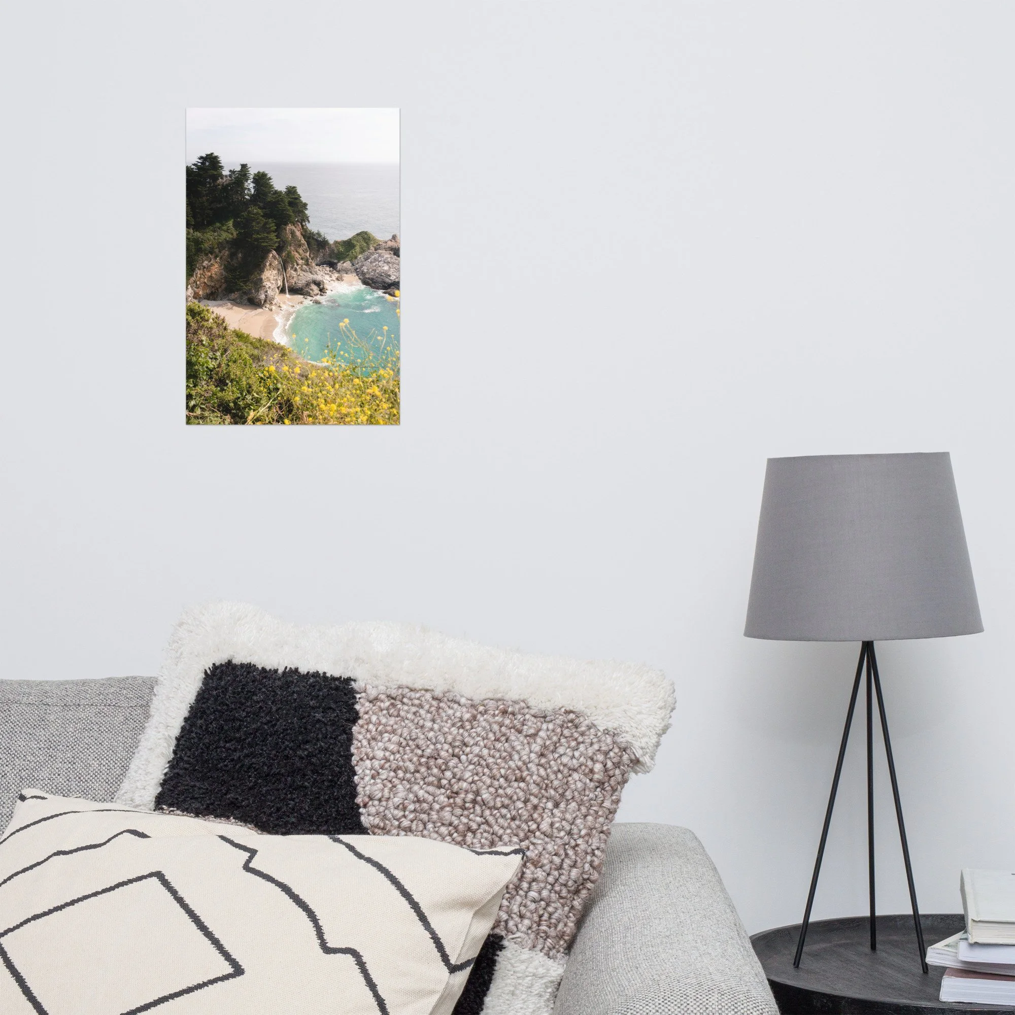 McWay Falls, a coastal icon. Tucked along the rugged cliffs of Big Sur, this rare coastal waterfall spills directly into the Pacific, framed by turquoise water, golden sand, and dramatic coastline. This print captures that quiet, breathtaking moment where land and ocean meet in perfect stillness.