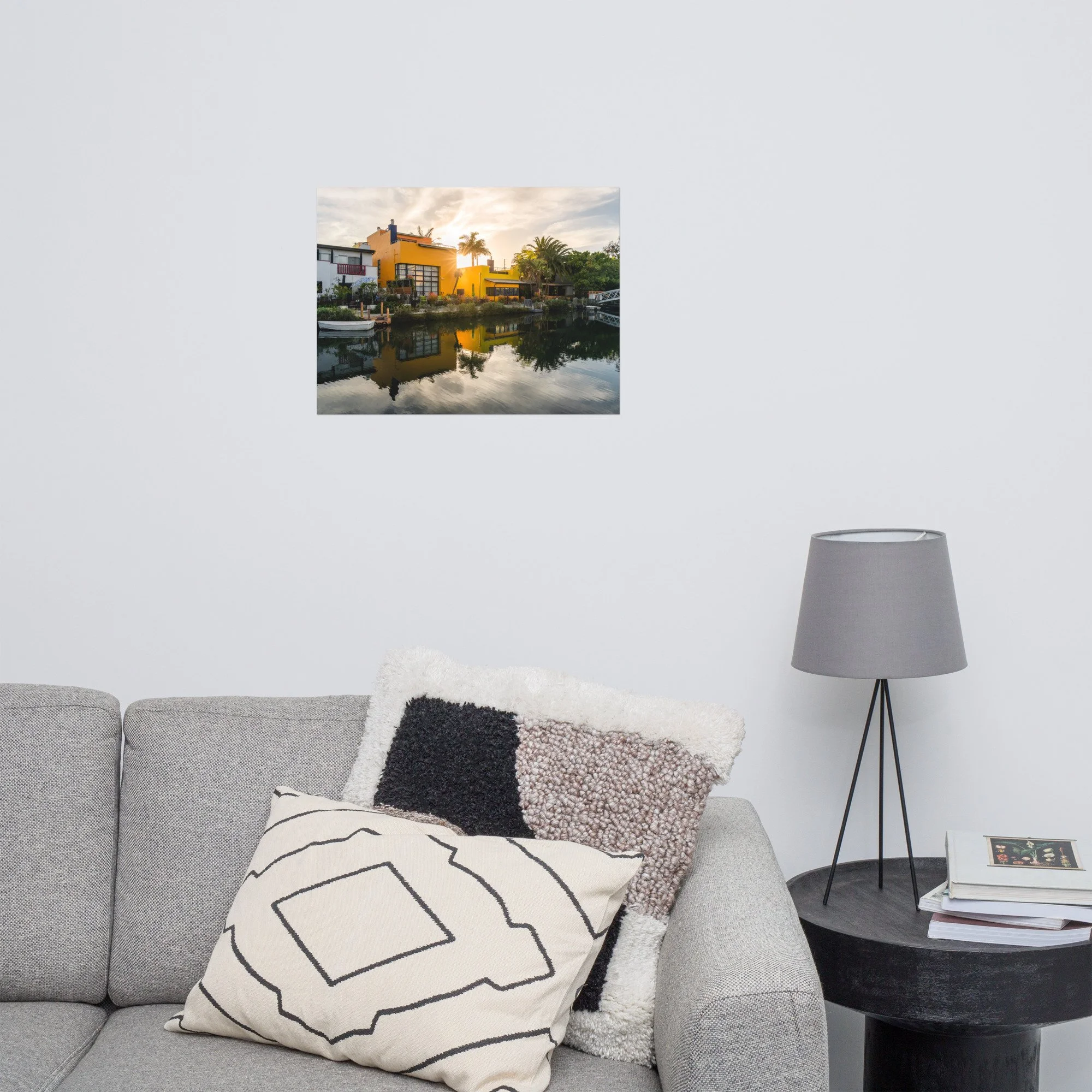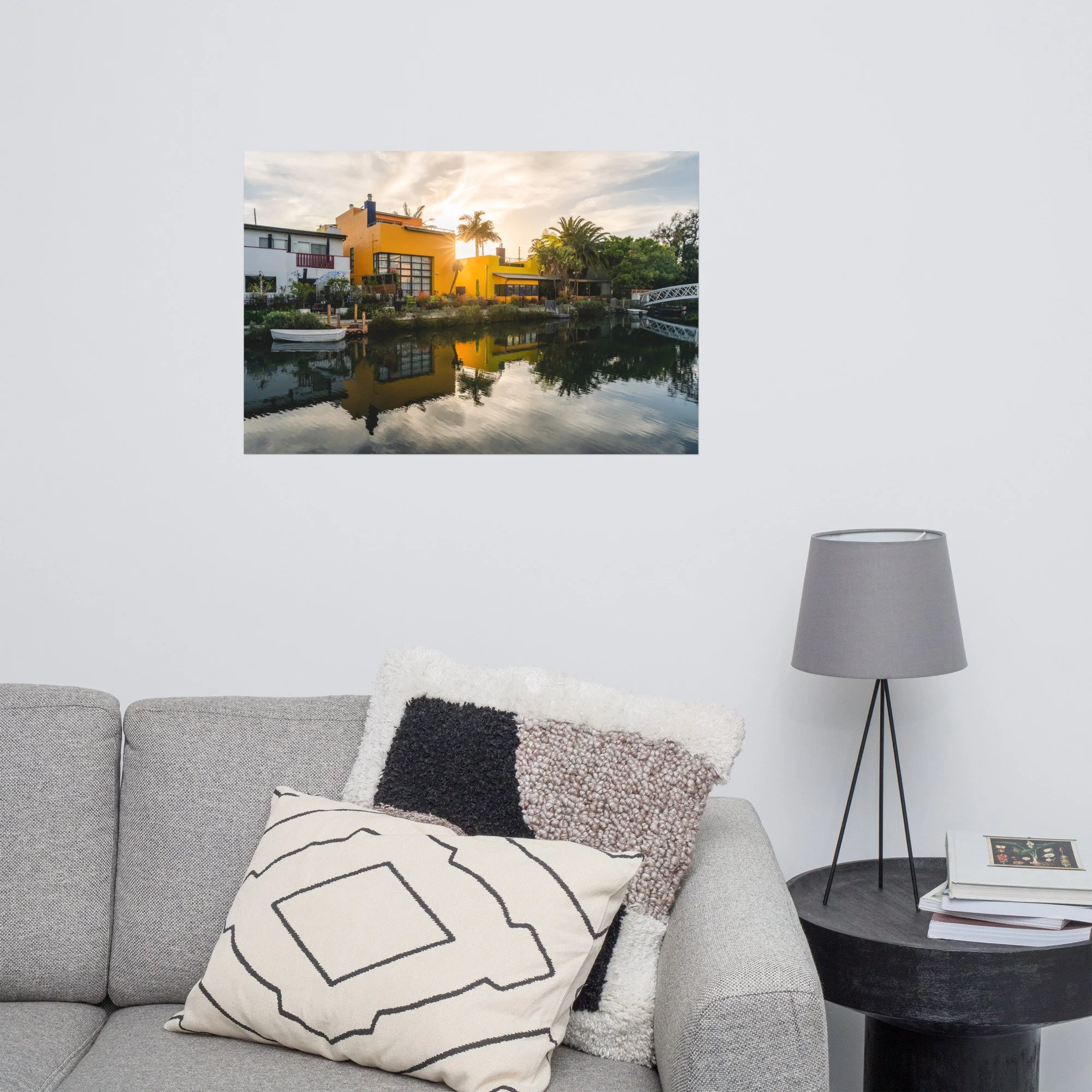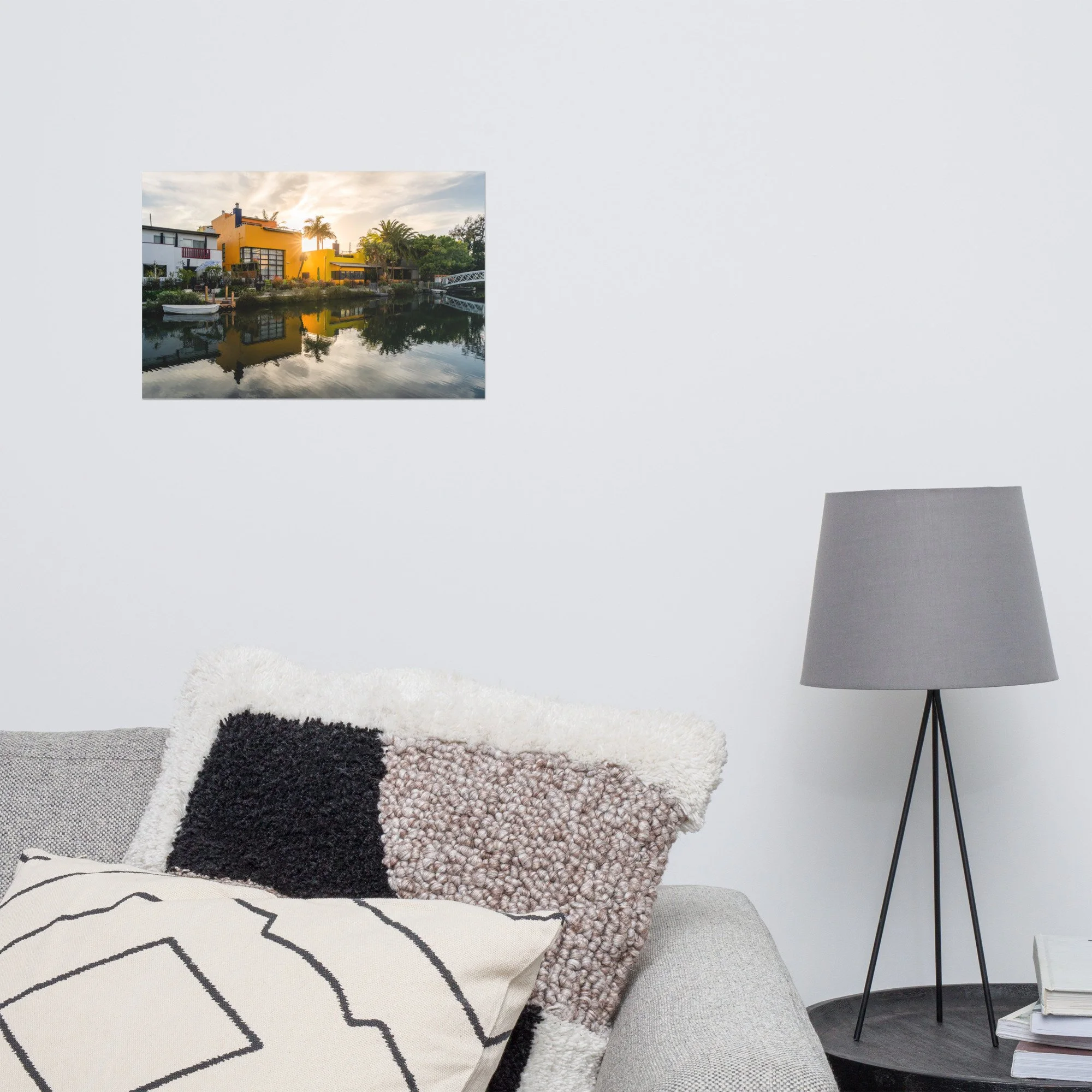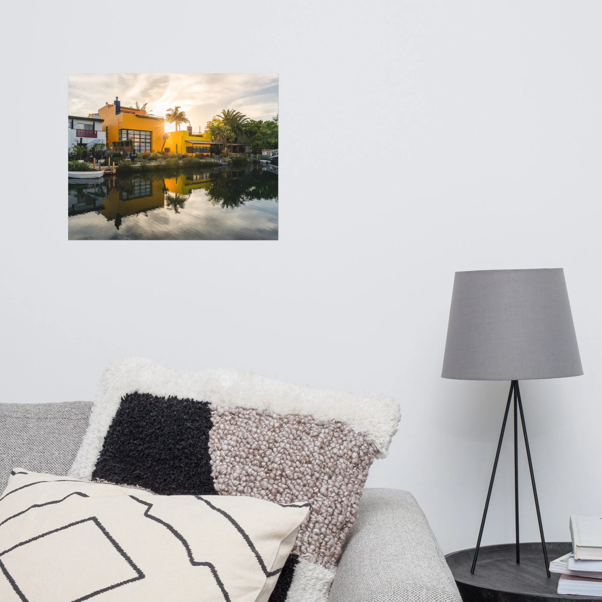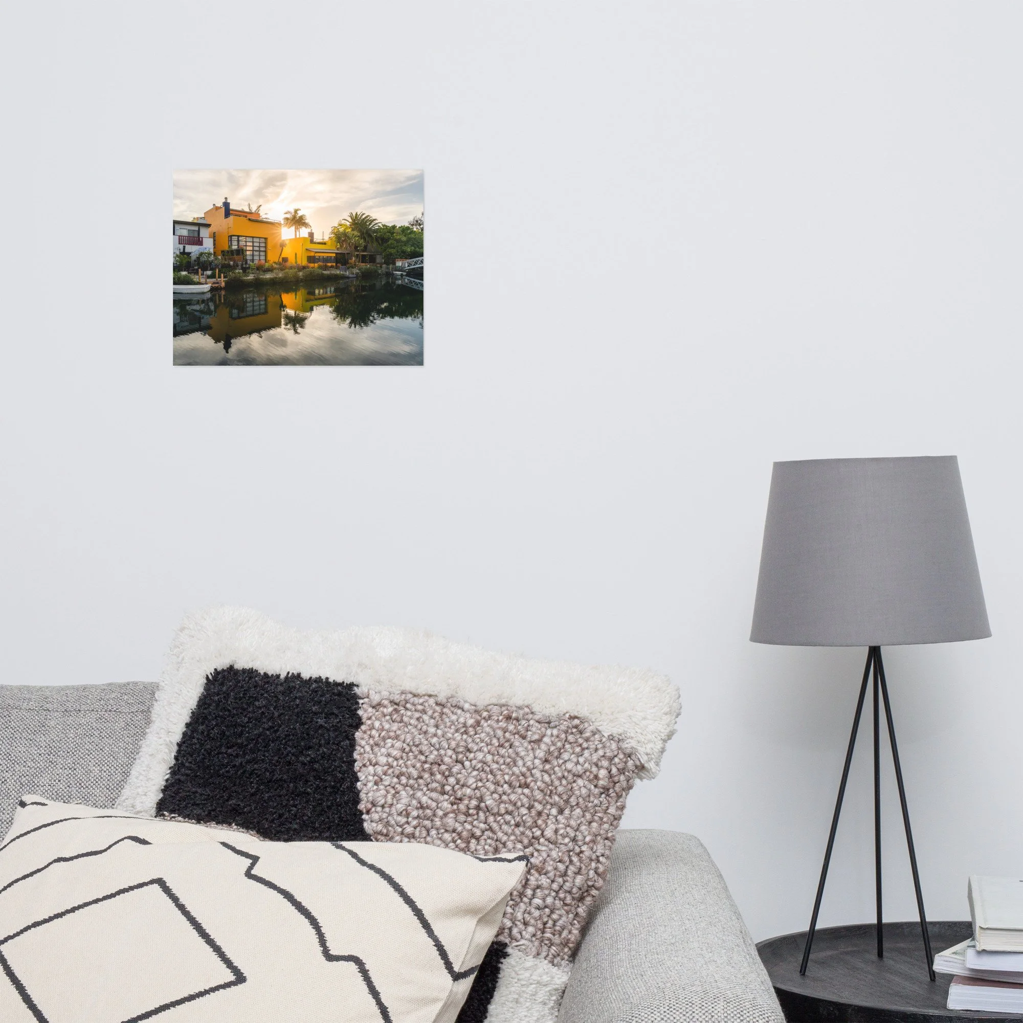 Warm sunlight washes over bold, colorful homes along the Venice Canals, creating rich reflections in the water below. This piece captures the essence of laid-back California living—where design, nature, and light come together effortlessly. Printed on premium luster photo paper with archival inks. Available in five sizes.