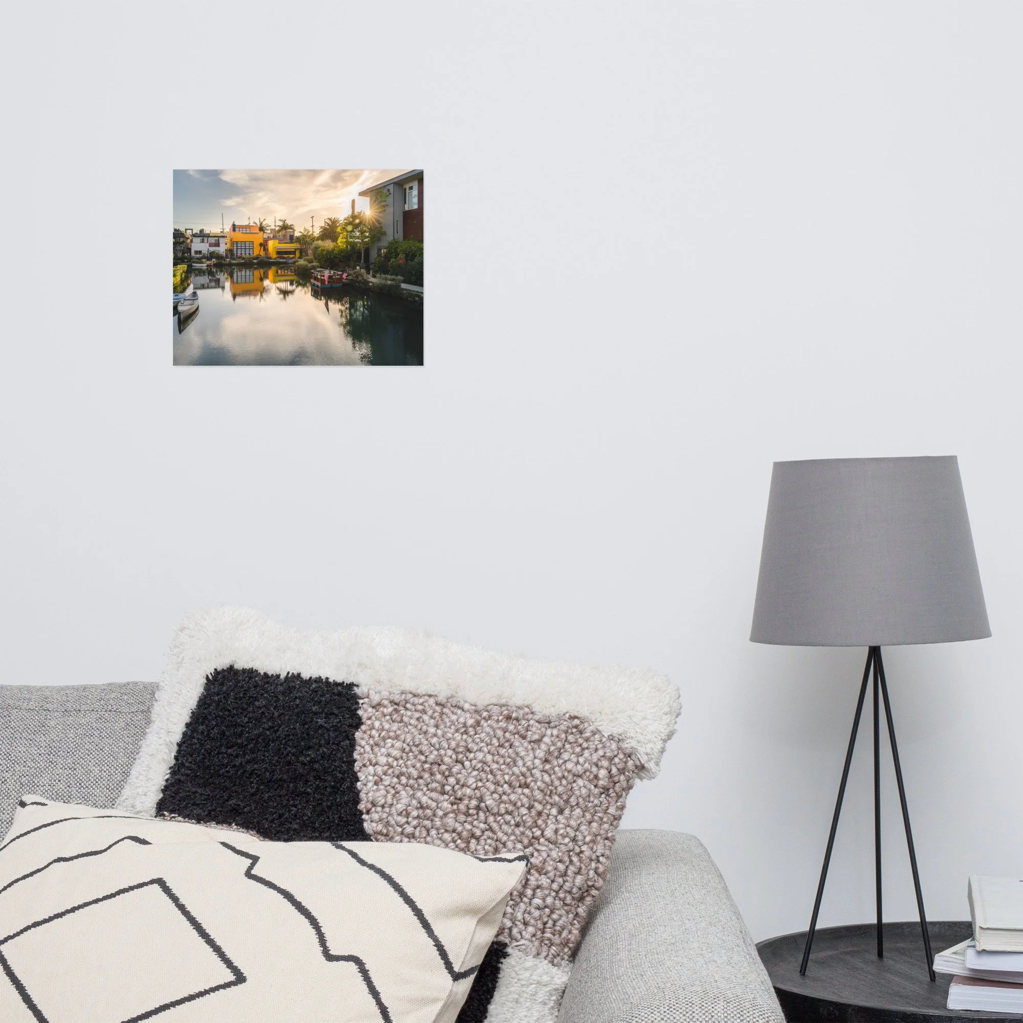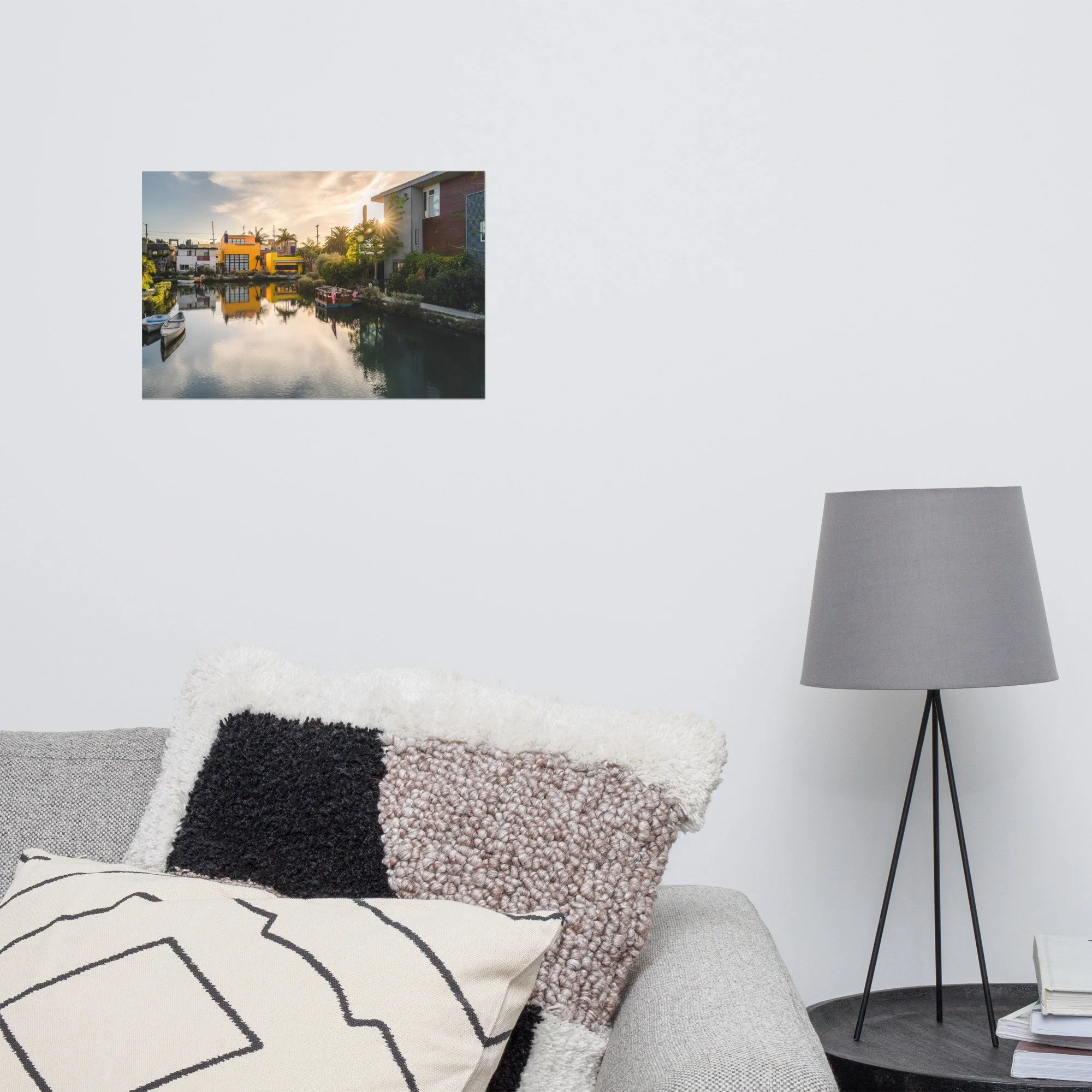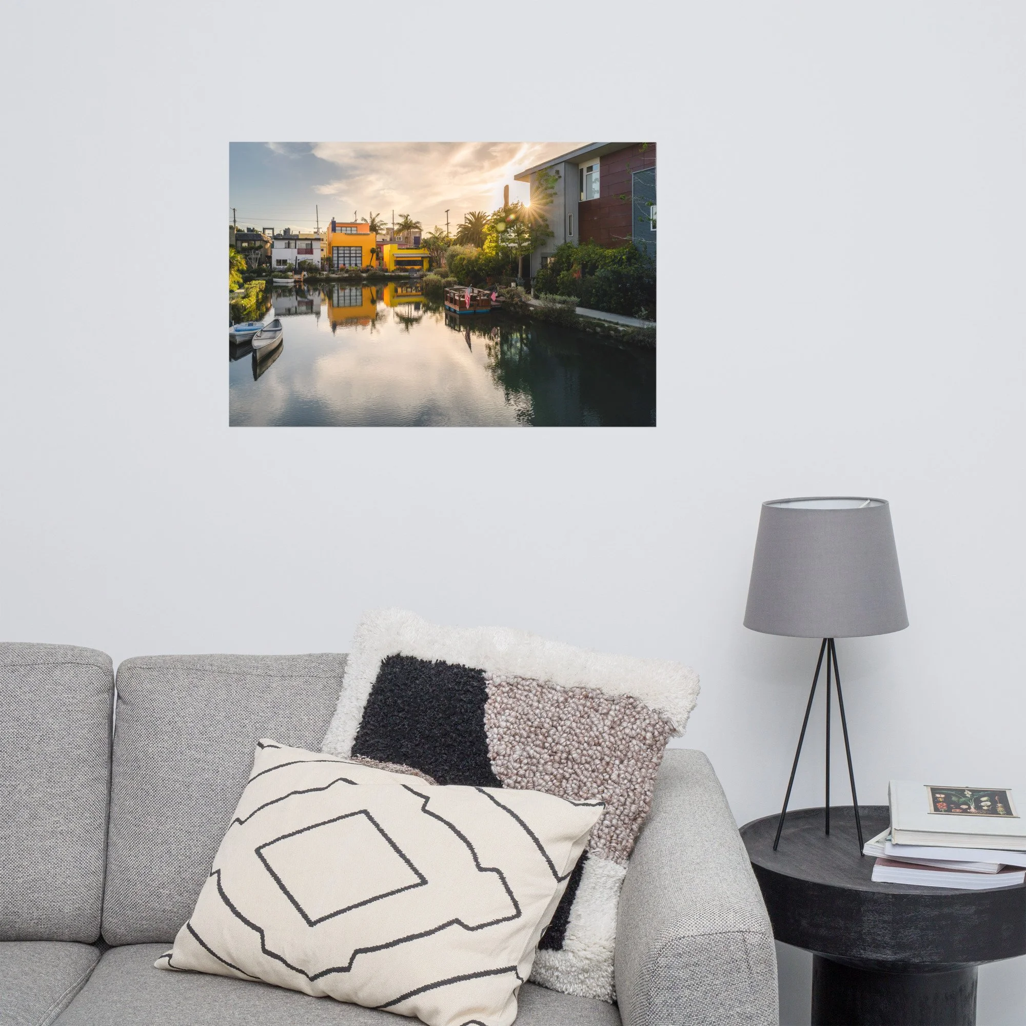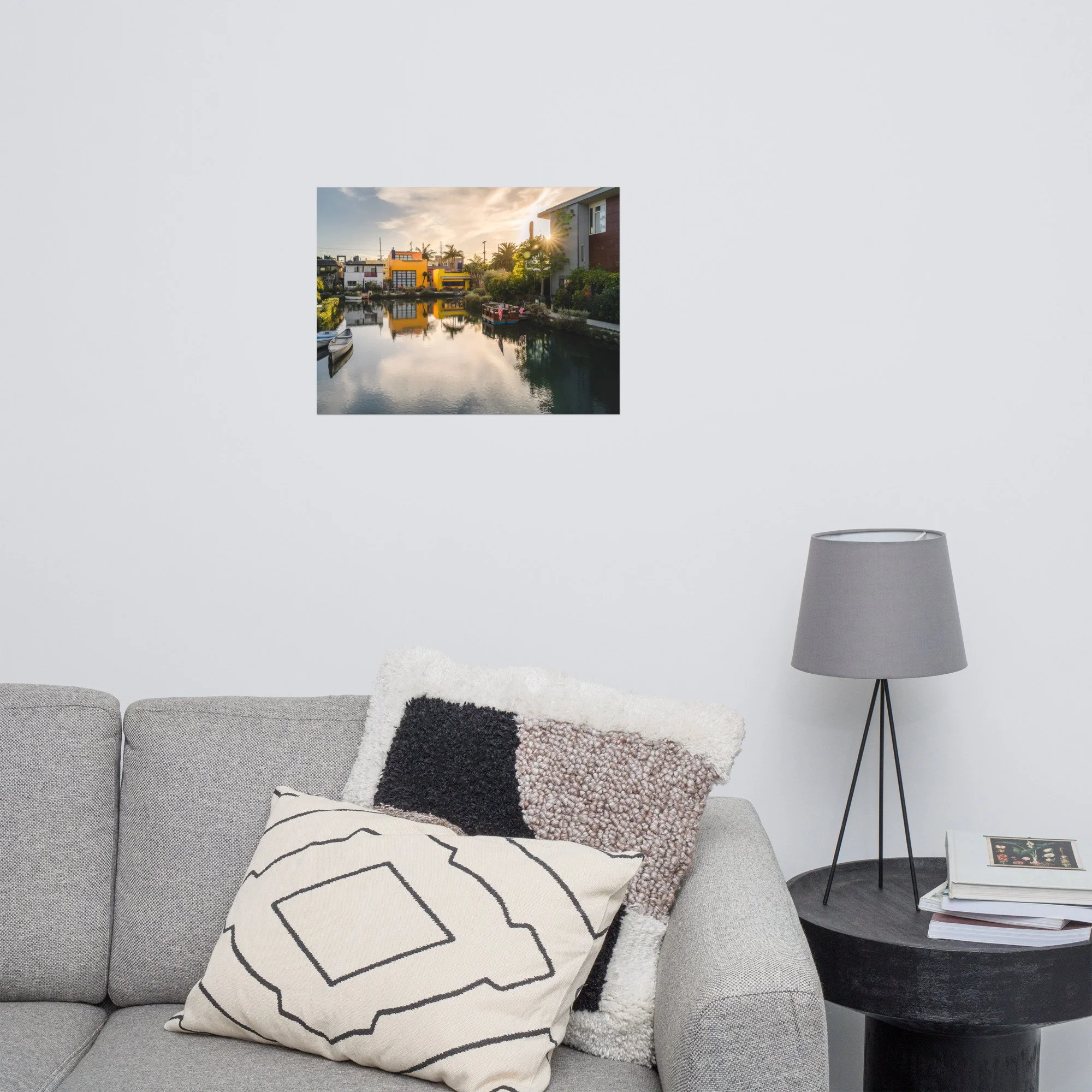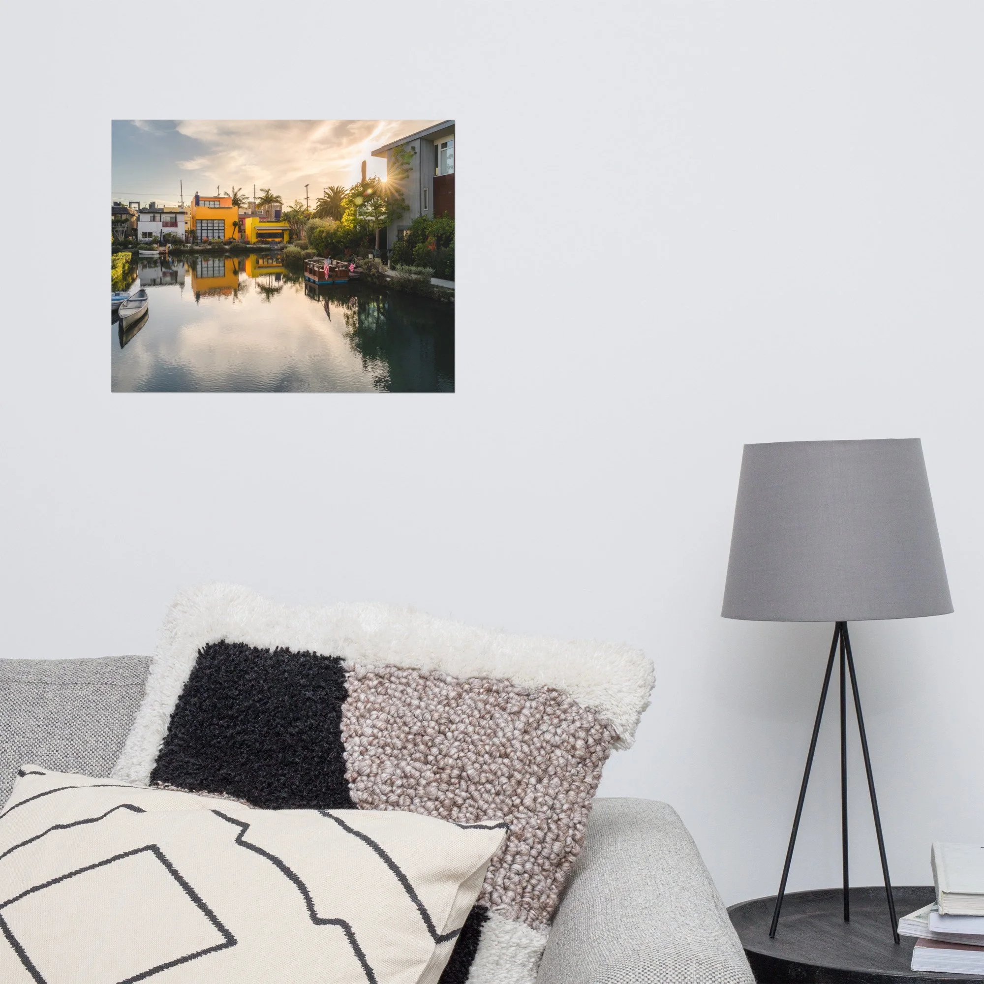 Sunlight peeks through the palms and architecture of the Venice Canals, casting a radiant glow across the water. Vibrant homes and mirrored reflections give this scene a lively yet peaceful energy capturing the magic of golden hour in Los Angeles. Printed on premium luster photo paper with archival inks. Available in five sizes.