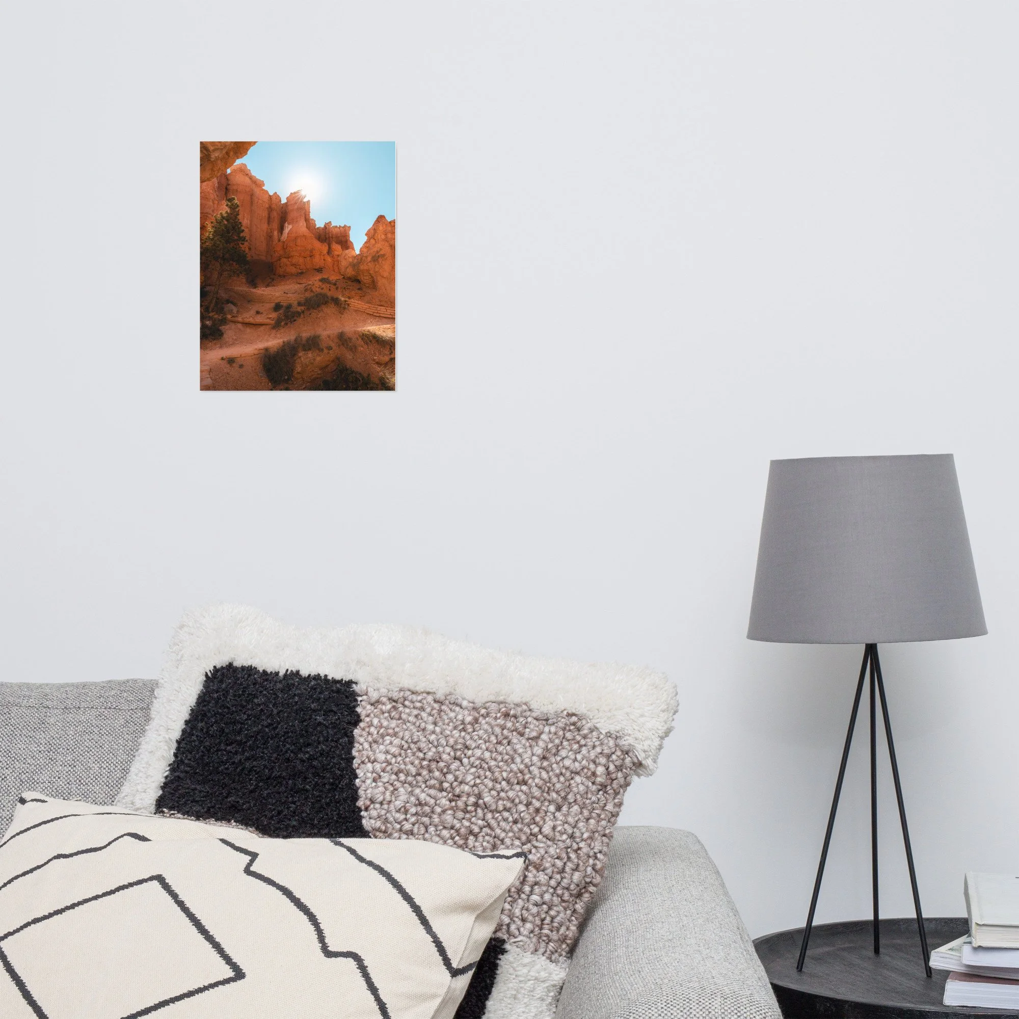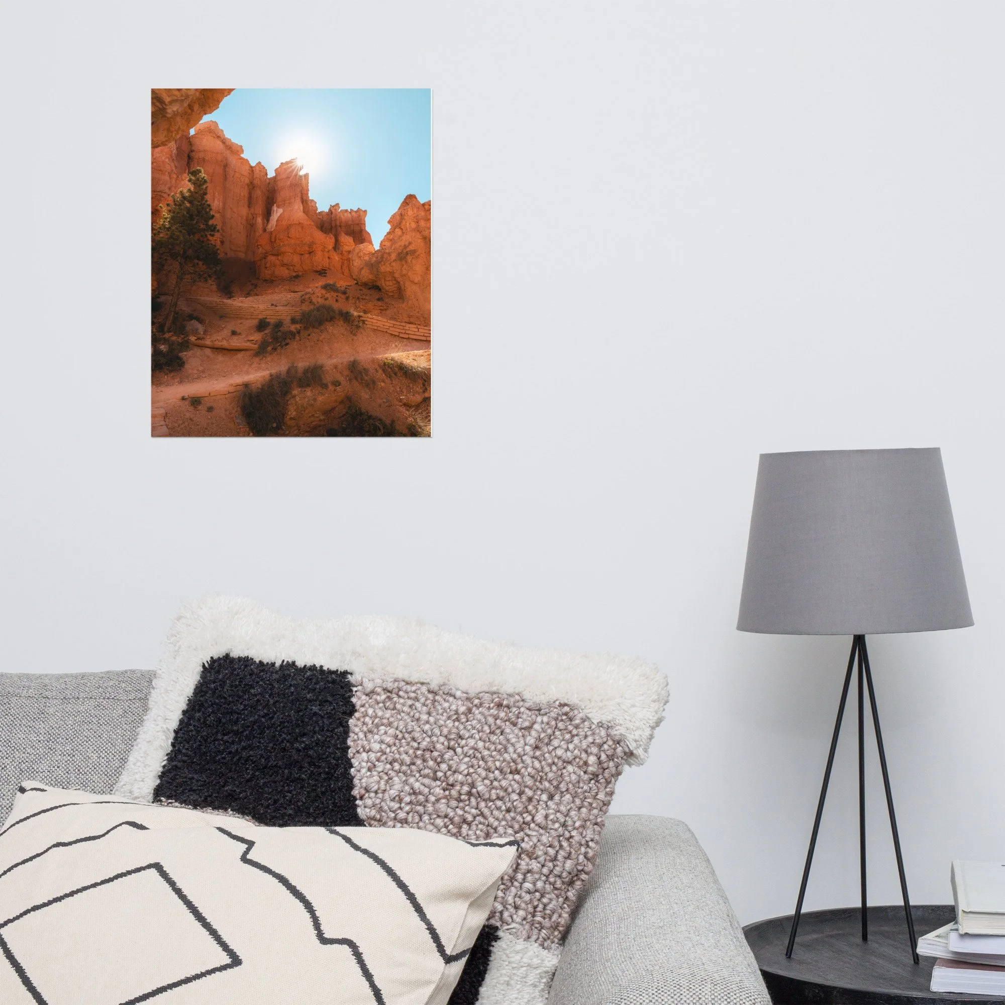 Bryce Canyon in full daylight, the amphitheater lit up under a wide blue sky, the hoodoos in their full warm color range from cream to deep orange-red. The daytime version of a place most people only see in dramatic night photography. Printed on premium luster photo paper with archival inks. Available in five sizes.